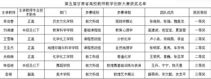 近日,第五届甘肃省高校教师教学创新大赛在兰州理工大学落下帷幕。西北师大10名教师(团队)与来自全省25所高校的130余名教师进入省赛现场决赛。经过评比,西北师大荣获一等奖2项、二等奖3项、三等奖2项,其中,历史文化学院李迎春教授(团队)荣获大赛一等奖。根据比赛结果排名,李迎春教授(团队)将代表甘肃省参加全国总决赛。