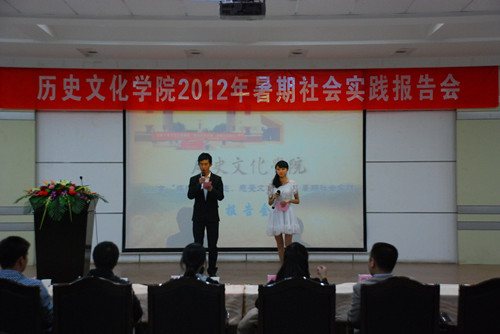 2010级学生张凯、齐晓芳、廉海洋、徐春梅、黄晓丽五位同学就本次实践活动成果做了主题报告,分别为《西夏碑的出土与意义》、《佛教文化在凉州》、《雷台汉代墓葬文化》、《陇右学府---武威文庙》、《感受河西自然风光之武威》。同时精彩的文艺节目穿插其中,为报告会增添了色彩。