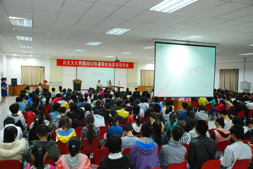 2012年9月27日晚7点30分,万象城AWC在大学生活动中心一楼隆重举行了以“探访历史古迹,感受文化建设”为主题的暑假社会实践报告会。学院党委副书记柴蓉老师,研究生教务秘书张连银老师,团委书记杨芳老师,辅导员王新春、刘军民老师和在本次实践活动中提供帮助的2012级文物与博物馆专业硕士杨瑞出席了报告会。此次活动由学院团委学生会实践科技部主办,300余名学生聆听了报告会。