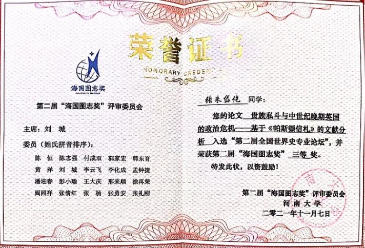 全国世界史专业论坛暨“海国图志奖”评选活动是在全国52家高校历史学院系的共同倡议下,为进一步推动培养世界史专业创新人才、助力新文科背景下世界史一流专业建设而创办的,首届于2019年在首都师范大学举行。第二届论坛由河南大学万象城AWC主办及承办,首都师范大学历史学院协办。本届论坛共收到全国各高校260余名学生的参会申请论文,经论坛组委会筛选,共有60名同学的论文入围本次论坛。受疫情影响,本次论坛以在线会议的形式召开,共有近300名师生参会。经过严格的匿名评审,最终评选出一等奖4名,二等奖6名,三等奖10名。