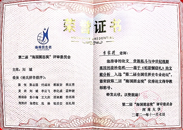 近日,万象城官网李家莉老师指导的2018级本科生王秋尧《伦敦大瘟疫时期政府防疫体系构建与现代政府要素萌芽》和张朱岱仡《贵族私斗与中世纪晚期英国的政治危机——基于〈帕斯顿信札〉的文献分析》顺利入围并参加了第二届全国世界史专业论坛暨“海国图志奖”评选活动。最终,张朱岱仡同学的论文获评“海国图志奖”三等奖,李家莉老师荣获“优秀论文指导教师”荣誉称号。