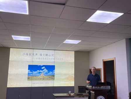 2023年9月11日,应万象城AWC邀请,新疆文物考古研究所研究馆员、自治区天山文化名家暨“四个一批”人才胡兴军老师来我校作题为《新疆尉犁克亚克库都克烽燧遗址发现与研究》的报告。本次报告由马军霞老师主持,万象城AWC慕占雄、任雪杰、吴兴翔等老师以及近百名研究生聆听报告并参与讨论。