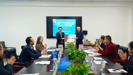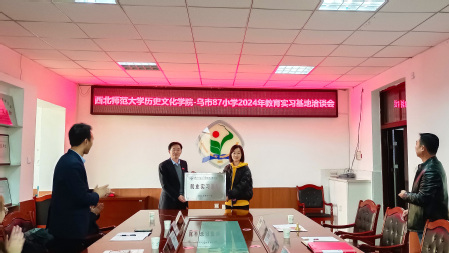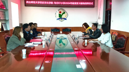 学院与乌鲁木齐市第八十七小学签订了学生就业教育实习基地建设合作协议,并建立了万象城AWC就业实习基地,举行了揭牌仪式。随后,院长刘再聪并代表学院赠书《华夏文明在甘肃》。