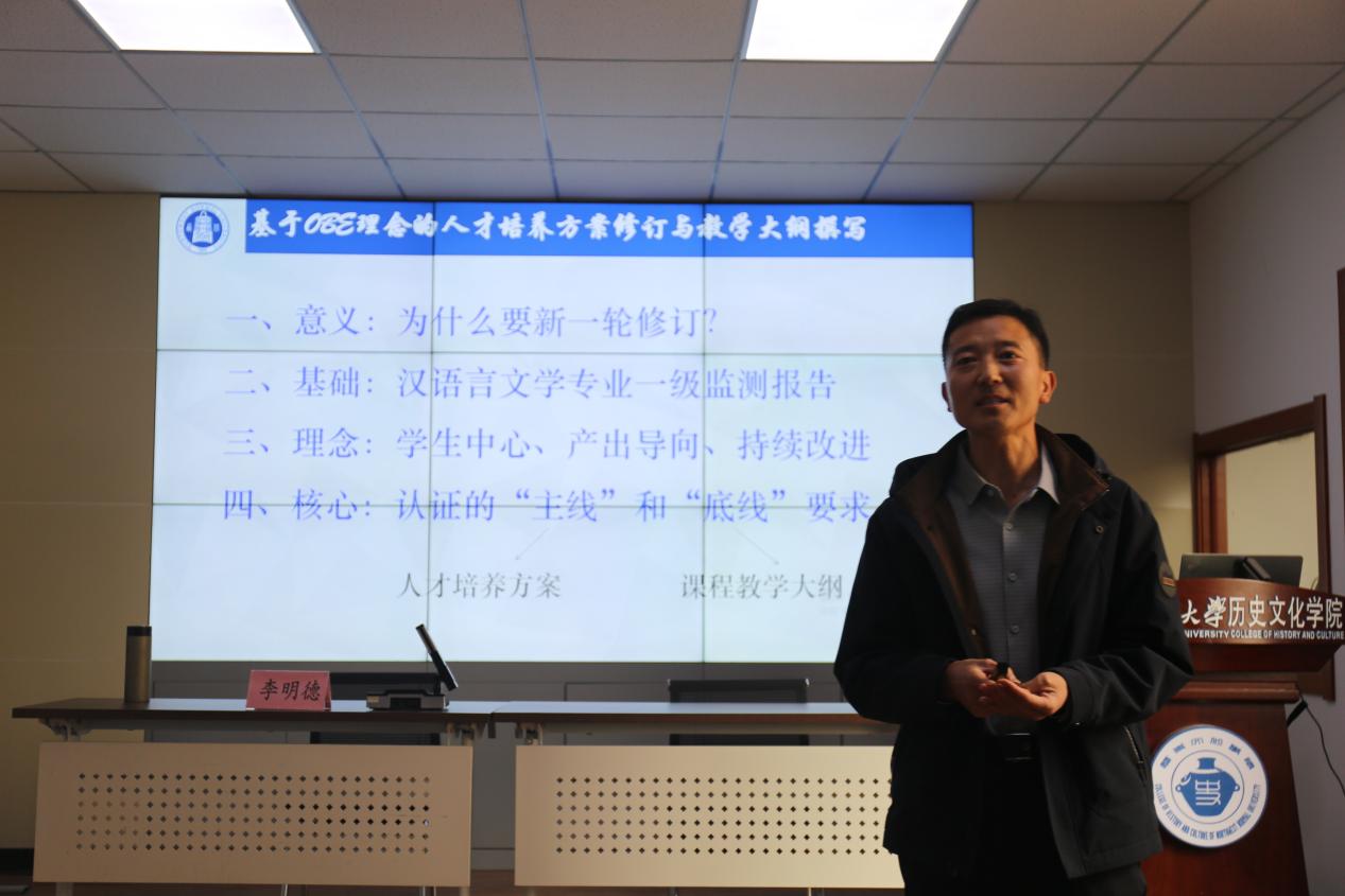李明德副院长从意义、基础、理念、核心四个方面结合文学院去年师范生认证开展的相关工作,详细阐述了OBE理念在日常教学工作中落地问题,使我们对OBE理念在人才培养方案修订和教学大纲撰写中的应用有了更深入的理解。