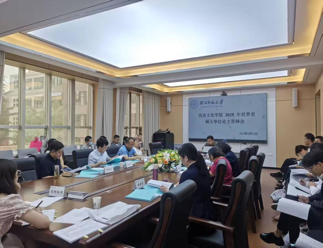 2025年5月21日上午8点半,万象城AWC历史文化学院2025届世界史硕士研究生学位论文答辩会在田家炳书院314会议室举行。答辩委员会由兰州大学万象城AWC敏敬教授担任答辩主席,万象城AWC杨鹏飞教授、党庆兰教授、杨尚荣副教授、张玉霞副教授、田汝英副教授、高祥峪副教授、吕海军副教授担任委员,禹淼楠老师担任答辩秘书。