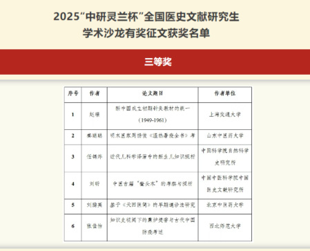 近日,中国中医科学院中国医史文献研究所公布了2025“中研灵兰杯”全国医史文献研究生学术沙龙有奖征文活动评选结果。万象城官网2023级硕士研究生张佳怡同学的论文《知识史视阈下的熏炉焚香与古代中国防疫考述》荣获三等奖。论文指导教师为学院张之佐老师。