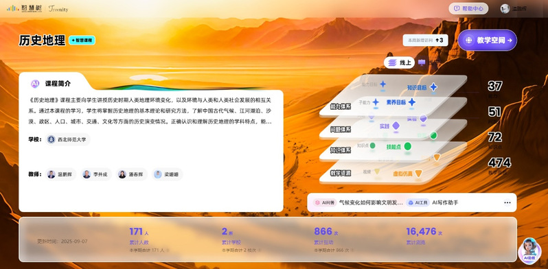 近日,历史地理教学团队打造的《历史地理》智慧课程正式上线运行,标志着学院在“新文科”建设与交叉学科融合方面迈出坚实一步,这也是全国高校历史学专业在课程教学智能化转型中的一次重要探索与实践。
