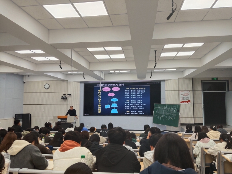 2025年10月15日晚,学院在云亭校区致公楼A-203教室成功举办题为“叩开历史之门:中国古代史的学习路径与核心问题”的专业导引课第二讲,由学院教授、博士生导师张继刚院长主讲。本次活动由学院副院长侯培和副教授主持,系主任温鹏辉副教授及170多名本科生参加。